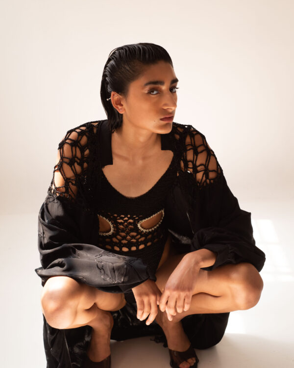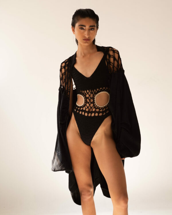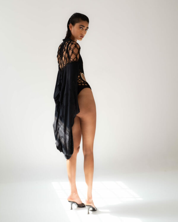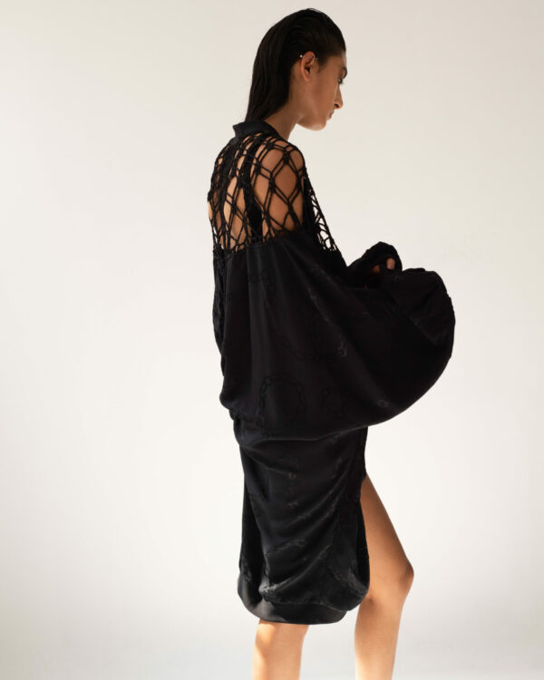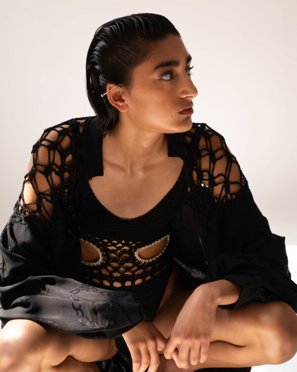 SĀDH's Vritra maxi dress has a twisted cut-out long-sleeve design and features handmade crochet abstract sleeves. Vritra offers a striking blend of bold design and artisanal craftsmanship. The twisted cut-out details add a dynamic edge, while the intricate crochet sleeves evoke a sense of creativity and texture. A perfect choice for those who appreciate sophisticated, thought-provoking fashion with a touch of uniqueness.